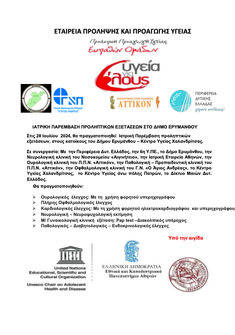 Ολοκληρωμένη Ιατρική Παρέμβαση προληπτικών εξετάσεων στους κατοίκους του Δήμου Ερυμάνθου – Κ.Υ. Χαλανδρίτσας, στις 28.07.2024 Home / Ενημέρωση / Ενημερωτική αφίσα Δήμου Ερυμάνθου