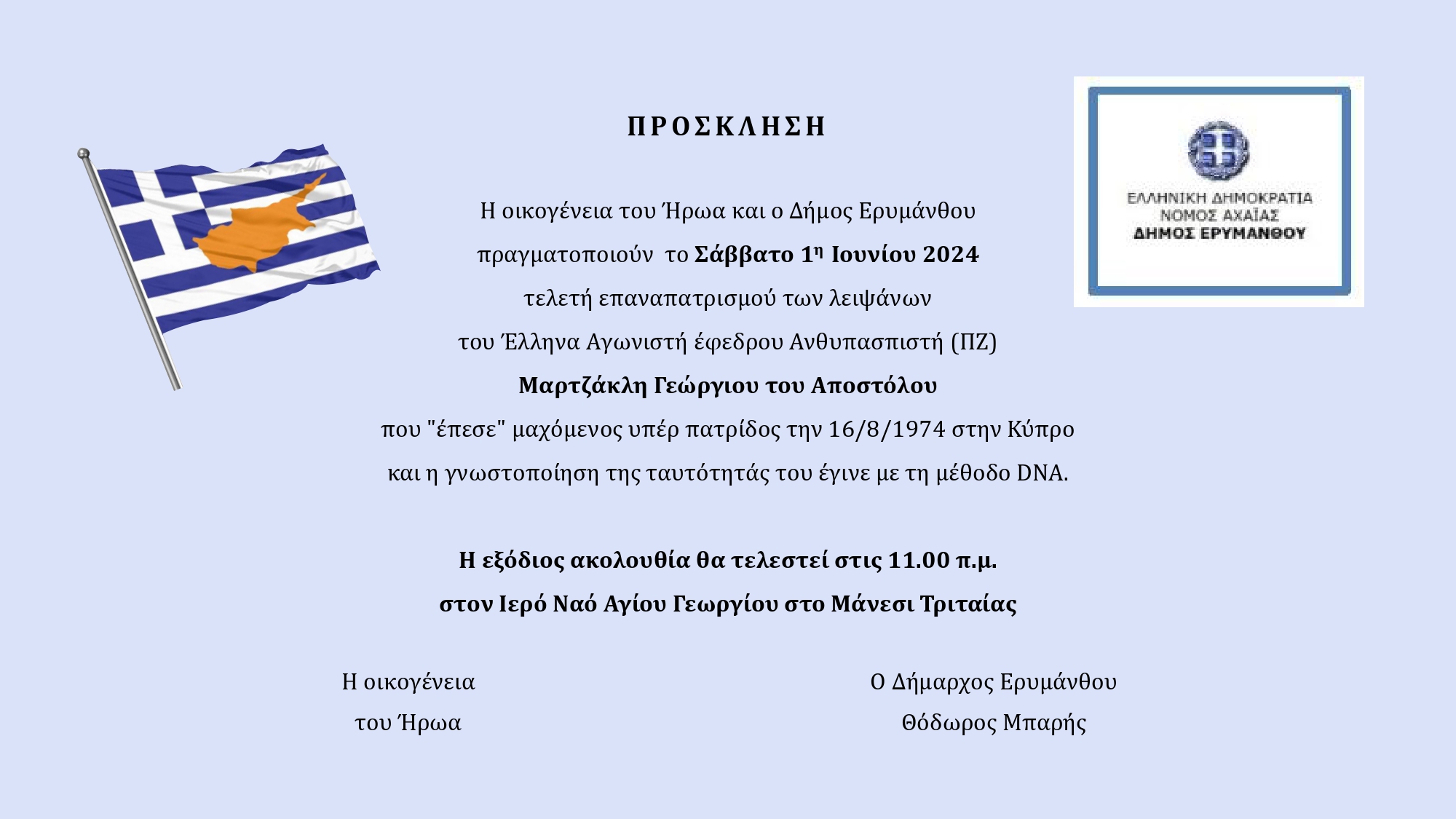 ΠΡΟΣΚΛΗΣΗ Τελετής επαναπατρισμού Λειψάνων Μαρτζάκλη Γεώργιου του Αποστόλου 1/6/2024 Home / Ενημέρωση / ΠΡΟΣΚΛΗΣΗ