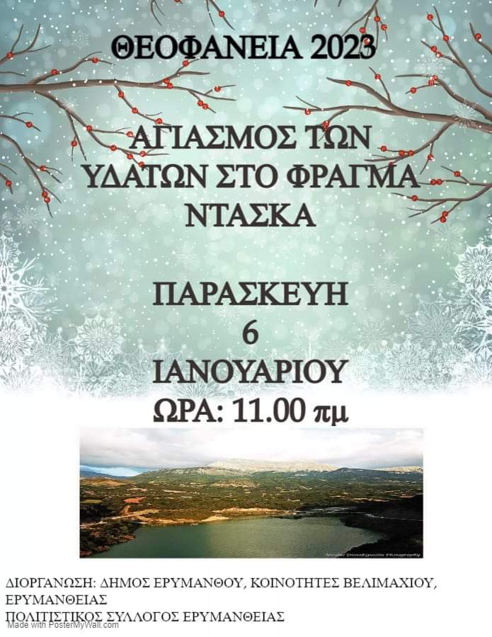 Ο Δήμος Ερυμάνθου, οι Kοινότητες Βελιμαχίου και Ερυμάνθειας και ο Πολιτιστικός Σύλλογος Ερυμάνθειας σας προσκαλούν να παραστείτε στο χώρο της Λιμνοδεξαμενής Ντασκά την Παρασκευή 6 Ιανουαρίου 2023 και ώρα 11 π.μ., όπου θα πραγματοποιηθεί ο Αγιασμός των Υδάτων.