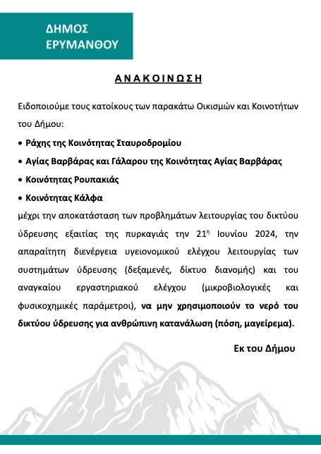 ΑΝΑΚΟΙΝΩΣΗ – ΜΗ ΧΡΗΣΗΣ ΥΔΑΤΟΣ ΓΙΑ ΠΟΣΗ