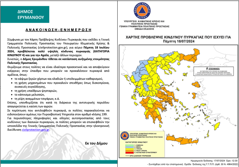 ΑΝΑΚΟΙΝΩΣΗ: πολύ υψηλός κίνδυνος πυρκαγιάς (ΚΑΤΗΓΟΡΙΑ ΚΙΝΔΥΝΟΥ 4) για Πέμπτη 18 Ιουλίου 2024 στην Αχαΐα