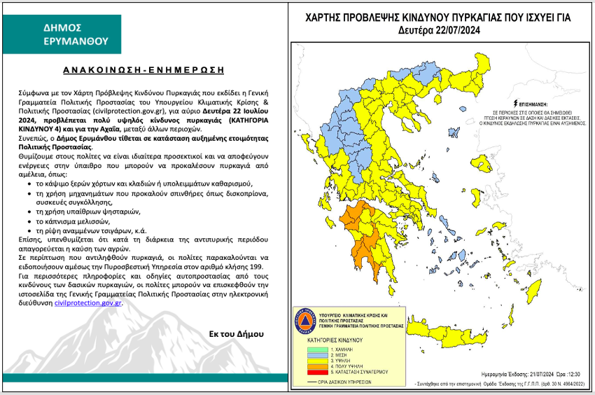 ΑΝΑΚΟΙΝΩΣΗ: πολύ υψηλός κίνδυνος πυρκαγιάς (ΚΑΤΗΓΟΡΙΑ ΚΙΝΔΥΝΟΥ 4) για Δευτέρα 22 Ιουλίου 2024 στην Αχαΐα Home / Ενημέρωση / ΑΝΑΚΟΙΝΩΣΗ-πολύ υψηλός κίνδυνος πυρκαγιάς (ΚΑΤΗΓΟΡΙΑ ΚΙΝΔΥΝΟΥ 4) Δευτέρα 22-07-2024