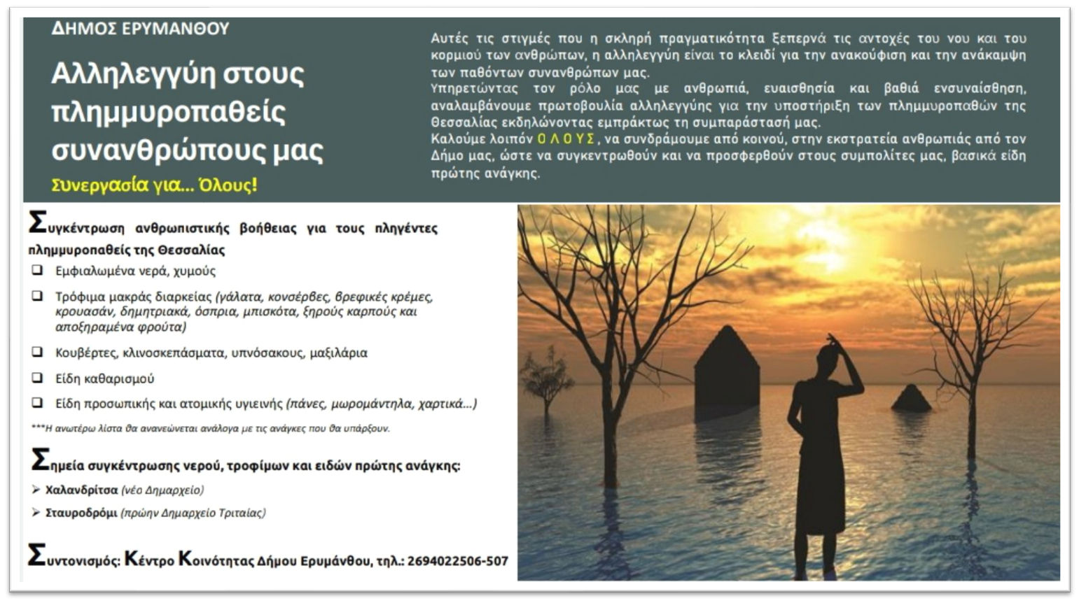Πρωτοβουλία αλληλεγγύης του Δήμου Ερυμάνθου για την υποστήριξη των πλημμυροπαθών της Θεσσαλίας
