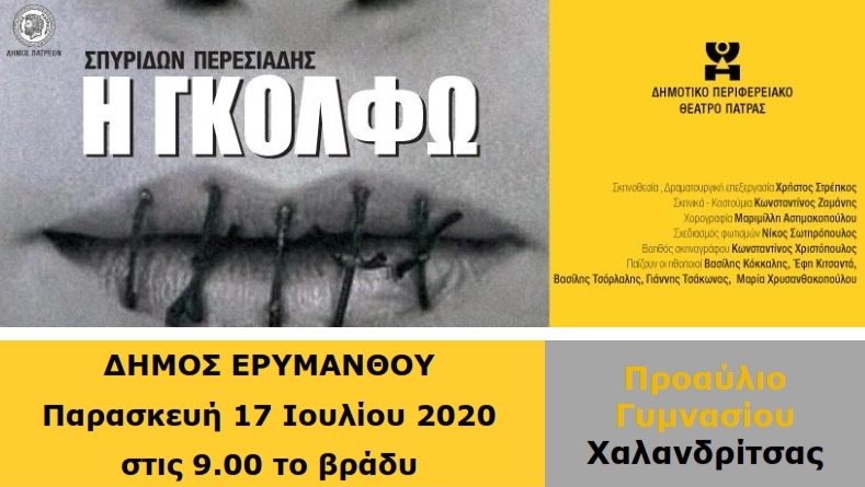 Στο πλαίσιο της συνεργασίας με την Περιφερειακή Ένωση Δήμων (Π.Ε.Δ.) Δυτικής Ελλάδας και με τη στήριξη του Δήμου Ερυμάνθου θα πραγματοποιηθεί η θεατρική παράσταση «Γκόλφω» από το «Άρμα Θέσπιδος», την Παρασκευή 17 Ιουλίου στις 9.00 το βράδυ στο προαύλιο του Γυμνασίου Χαλανδρίτσας.