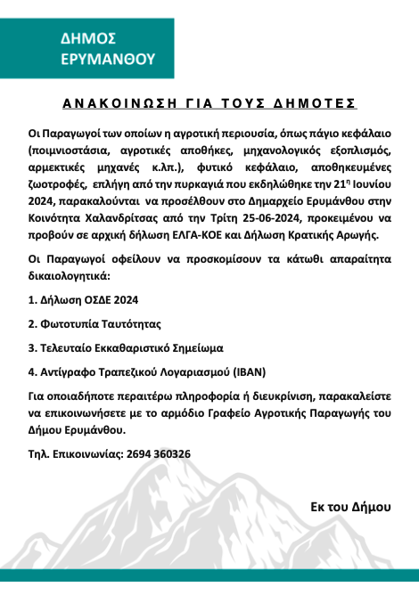 Aνακοίνωση: Δήλωση EΛΓA – KOE & Δήλωση Κρατικής Αρωγής πληγέντων Παραγωγών Δήμου Ερυμάνθου από την δασική πυρκαγιά στις 21-06-2024 Home / Ενημέρωση / Δήλωση EΛΓA-KOE και Δήλωση Κρατικής Αρωγής πληγέντων Παραγωγών Δήμου Ερυμάνθου από δασική πυρκαγιά στις 21-06-2024