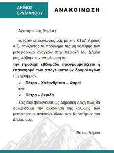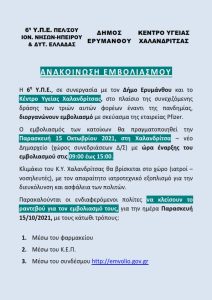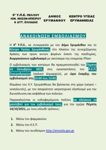 Η 6η Υ.Π.Ε., σε συνεργασία με τον Δήμο Ερυμάνθου και τα Κέντρα Υγείας Ερυμάνθειας & Χαλανδρίτσας διοργανώνουν εμβολιασμό στις 14 & 15/10/2021 αντίστοιχα ΑΝΑΚΟΙΝΩΣΗ ΕΜΒΟΛΙΑΣΜΟΥ Κ.Υ.Ερυμάνθειας_15_10_2021 ΑΝΑΚΟΙΝΩΣΗ ΕΜΒΟΛΙΑΣΜΟΥ Κ.Υ.Χαλανδρίτσας._15_10_2021