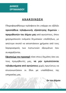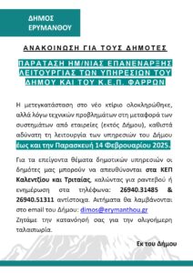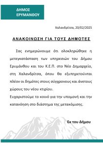 «Την Πέμπτη 5 Δεκεμβρίου 2024 και ώρα 18.00 στην αίθουσα του δημοτικού συμβουλίου του Δήμου Ερυμάνθου στην Χαλανδρίτσα από πλευράς του Αναδόχου Σχήματος του Έργου με την επωνυμία «ΠΑΝΑΓΙΩΤΗΣ ΚΑΡΑΜΟΣΧΟΣ ΚΑΙ ΣΥΝΕΡΓΑΤΕΣ Ε.Ε. με δ.τ. MTC – ΜΑΚΕΔΟΝΙΚΗ ΤΕΧΝΙΚΗ ΕΤΑΙΡΕΙΑ – ΑΙΚ. ΓΕΩΡΓΟΥΛΑ ΚΑΙ ΣΥΝΕΡΓΑΤΕΣ Ε.Ε. με δ.τ. ΚΛΕΙΣΘΕΝΗΣ Ε.Ε. – ΝΕΞΟΥΣ ΝΤΙΖΑΙΝ ΣΤΟΥΝΤΙΟ Ε.Ε. – ORBIS ENGINEERING ΣΥΜΒΟΥΛΟΙ ΜΗΧΑΝΙΚΟΙ Ι.Κ.Ε. με δ.τ. ORBIS ENGINEERING – ΠΑΛΑΙΟΧΩΡΙΤΗΣ Κ. – ΚΑΝΔΗΛΑ Θ. Ο.Ε. με δ.τ. ΚΑ.ΠΑ. Ο.Ε. – ΕΛΛΗΝΙΚΗ ΜΕΛΕΤΗΤΙΚΗ ΑΝΩΝΥΜΟΣ ΤΕΧΝΙΚΗ ΕΤΑΙΡEΙΑ» θα πραγματοποιηθεί η Δημοσιοποίηση των Εναλλακτικών Σεναρίων Χωρικής Ανάπτυξης της μελέτης Τοπικού Πολεοδομικού Σχεδίου (ΤΠΣ) Δήμου Ερυμάνθπυ (Δ.Ε. Λεοντίου, Καλεντζίου, Φαρρών, Τριταίας).
